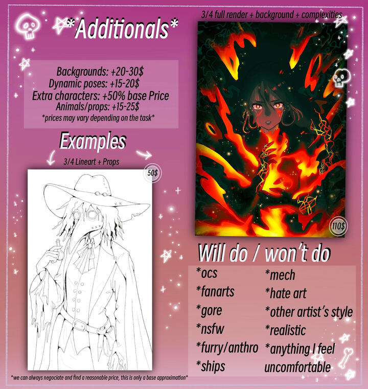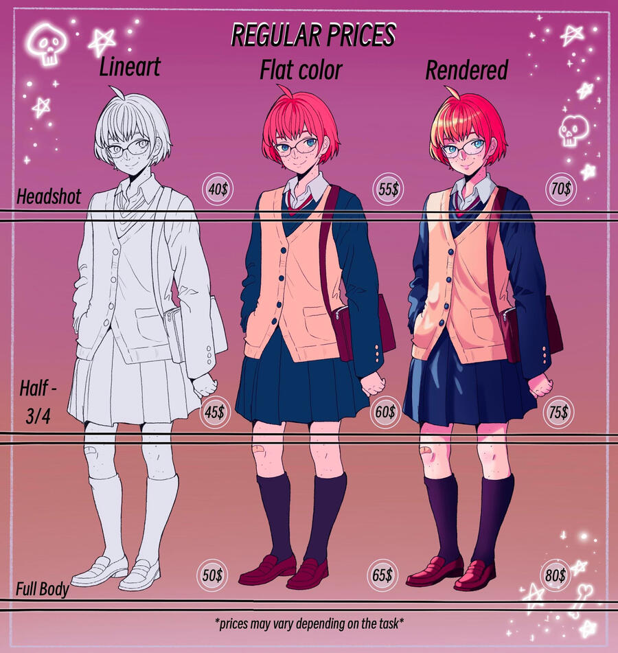 Prices may vary depending on what the commission is like. I currently only have prices for illustrations, but we can always negociate for other types of commissions or specifics.