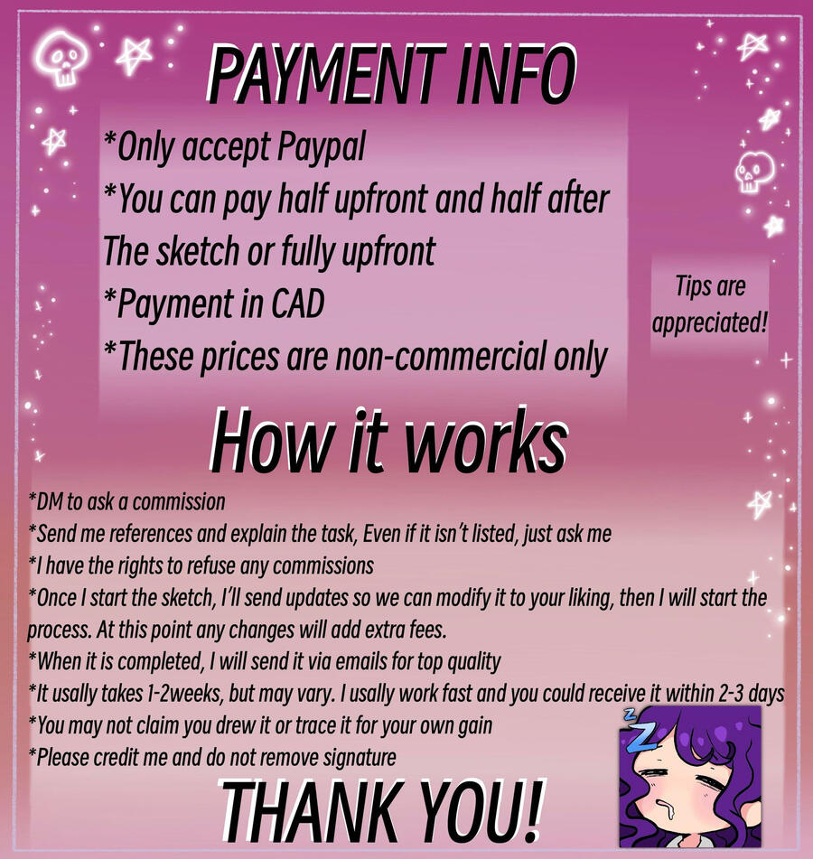 To contact me : send me a DM on Instagram, Twitter/X, Discord or on my Wix site. I only accepts Paypal as payment. My prices are non-commercial, we will need to discuss another price for commercial use.